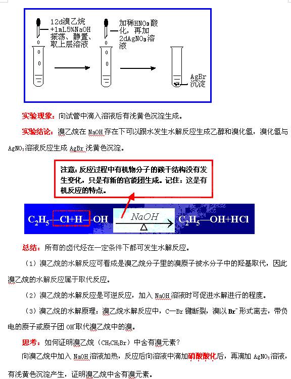 注意:检验卤代烃中卤素的实验步骤:a、取少量样品b、加NaOH溶液c、加热 d、冷却e、取上层清液向其中加入稀HNO3溶液f、加AgNO3溶液。