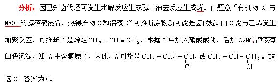 例2. 已知有机物A与NaOH的醇溶液混合加热得产物C和溶液D。C与乙烯混合在催化剂作用下可反应生成