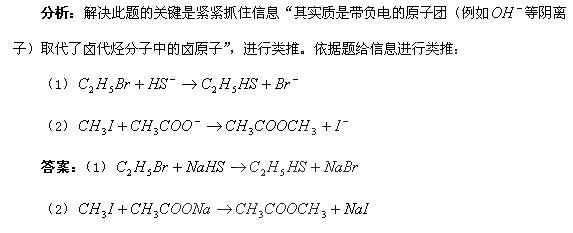 解析:由卤代烃在碱性条件下的水解反应的实质可知:⑴HS-取代溴生成CH3CH2SH;⑵CH3COO-取代I生成CH3CH2OOCCH3;⑶CN-取代I生成CH3CH2CN。