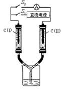 ③一段时间后(玻璃管中液面未脱离电极),断开S1,则C(I)、C(II)两玻璃管内气体的体积V(I)、V(II)的关系是:V(I) V(II)(填“>”、 “=”或 “<”) 。断开S1接通S2,电流表的指针发生偏转,此时电极C(II) 是 (填“正”或“负”) 极;C(I) 的电极反应是: 。