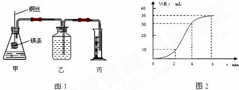 (1)(4分)取一段镁条,用砂纸擦去表面的氧化膜,使镁条浸入锥形瓶内足量的稀盐酸中。足量镁条与一定量盐酸反应生成H2的量与反应时间的关系曲线如图2所示。写出该反应的离子方程式___________________________________________,在前4min内,镁条与盐酸的反应速率逐渐加快,在4min之后,反应速率逐渐减慢,请简述其原因:____________________________________________ 。