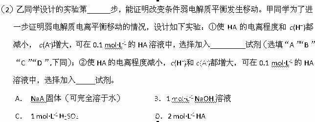 乙:① 用pH计测定物质的量浓度均为0.1 mol·L-1 HA和HCl溶液的pH;