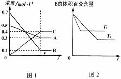 T℃时在1L密闭容器中A气体与B气体反应生成C气体。反应过程中A、B、C浓度变化如图1所示;若保持其他条件不变,温度分别为T1和T2时,B的体积百分含量与时间的关系如图2所示。则下列结论正确的是