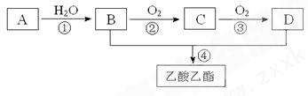 33、(6分)已知:①A是石油裂解气的主要成份,A的产量通常用来衡量一个国家的石油化工水平;现以A为主要原料合成乙酸乙酯,其合成路线如下图所示。