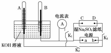23、如图装置中,A、B中电极为多孔的惰性电极;C、D为夹在湿的Na2SO4滤纸条上的铂夹,a、b为电源两极.在A、B中充满KOH溶液后使其倒立于盛有KOH溶液的水槽中.切断K1,闭合K2、K3,通直流电,电解一段时间后A、B中产生体积不相等的无色气体,如图所示.
