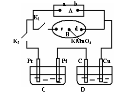(1)、关闭K1,打开K2,通电后,B的KMnO4紫红色液滴向d端移动,则电源a端