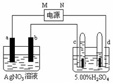 (5分)右图中电极a、b分别为Ag电极和Pt电极,电极c、d都是石墨电极。通电一段时间后,在c、d两极上共收集到336mL(标准状态)气体。请回答下列问题。