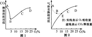 (2)下面二个图都是表示大气中O2浓度对某非绿色植物组织呼吸强度(以葡萄糖为底物)的影响,图一是以CO2释放的相对值来表示,图二是以气体交换的相对值来表示。请仔细分析两图,回答下列问题: