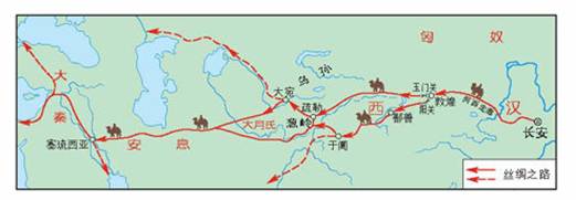 46、读丝绸之路示意图,回答问题:(书本99页4-55图)