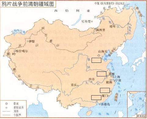 ①在图中方框内填写出《南京条约》被迫开放的通商口岸,这些规定开放的通商口岸的分布有什么特点?