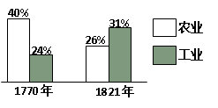右图是1770-1821年英国农业和工业在国民收入中的比重示意图。推动英国经济结构变化的主要因素是