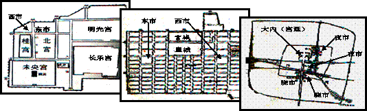 7.都城,往往是农业社会皇权与文化的集结处和辐射中心。而从下图(西汉、唐和北宋的都城)的城市布局上可以看出,都城在功能上呈现出新的变化趋势