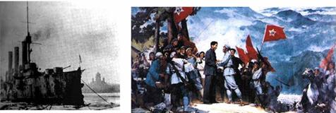 某实验中学历史课上老师组织学生讨论:结合上图讨论两国革命道路的不同。(4分)