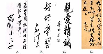5.台湾歌星周杰伦的歌曲《本草纲目》充满了对汉字独有的书法艺术的自豪: “如果华佗再世崇洋都被医治,外邦来学汉字激发我民族意识,……用书法书朝代内力传开,豪气挥正楷给一拳对白……”下面四幅图哪一幅属于歌词中提到的楷书