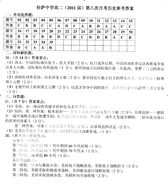 拉萨中学高二年级(2011届)第八次月考历史答题卡