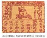 下图为宋代济南刘家功夫针铺印记。其上部文字为:“济南刘家功夫针铺”; 中部文字为“认门前白兔儿为记”;下部文字为“收买上等钢条,造功夫细针,不误宅院使用,转卖兴贩,别有加饶,请记白”。作为直接证据, 它可用以研究宋代的(