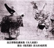 图二是《眼药酸》图。是南宋时为了宣传杂剧“眼药酸”而画的。两个穿戏装的演员,一人用手指着右眼,示意有眼病,另一人则背着布袋,袋上画着许多眼睛,扮眼科医生形象,手拿一瓶眼药酸,请有眼病的演员使用。