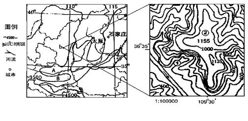 (1)分析左图等积温线资料,≥10℃的积温值太原 (填“大于”或“小于”)石家庄,试从地形角度分析两地产生差异的主要原因 。