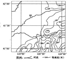 (2)甲处:V形河谷(1分)。成因:流经山区(或“位于上游”)(1分),河流侵蚀强烈(1分)。