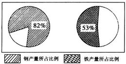 材料二 1901年日本八幡钢铁厂钢.铁产量占全国总产量的比例图(图中阴影部分为八幡钢铁厂的比例),其原料主要是从中国掠夺的湖北大冶铁矿石。