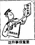 解析:结合漫画题目“这件事很重要”,漫画中“党政文件”、“群众利益”等文字叙述,可发现国家高度重视人民群众的切身利益,折射出我国是人民当家作主的社会主义国家,党和政府坚持以人为本的执政理念。因此,可概括为:(1)群众利益无小事。(2)党和政府坚持以人为本的执政理念。(3)党员干部要坚持全心全意为人民服务的宗旨。(4)我国是人民当家作主的社会主义国家。(5)我党坚持立党为公、执政为民。(6)中国共产党始终代表最广大人民的根本利益等。