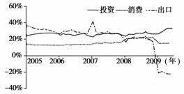 [解析] 从图中可以看出,受金融危机的影响,从2008年下半年开始我国消费、出口均出现下滑,而受扩大内需政策的影响,投资明显上升,故选B。A、D表述错误,C不符合题意。