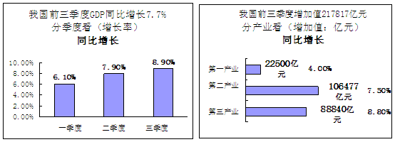 材料一反映我国前三季度GDP逐步增长;三大产业同比增长的速度依次是三、二、一产业。(2分)