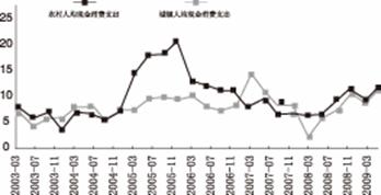 1、材料一:2003年一季度-2009年二季度农村居民人均现金消费支出和城镇居民人均消费支出实际增速变化情况(%)