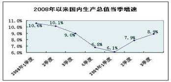 图1反映了2008年至2009年第一季度我国GDP增速呈下降趋势,而2009年第一季度至第三季度我国GDP增速呈上升趋势,整个增速呈V字型,说明我国GDP今年“保八”有望,经济实力增强。