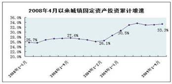 图2反映了2008年4月以来城镇固定资产投资累计增速成波浪性,总体呈上升趋势。说明我国加大投资拉动经济发展。