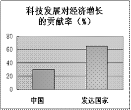图表一反映了发达国家科技发展对经济增长的贡献率大大高于中国;图表二反映了世界500强企业的研发投入大大高于中国500强企业。(2分)这反映了研发投入与科技发展对经济增长的贡献率呈正相关关系。(2分)