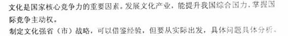 (3)面对激烈的国际竞争,提升我国文化产业竞争力的意义何在?请对制定文化强省(市)战略提出方法论的建议。(6分)