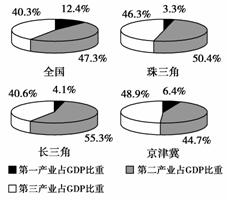 答案 (1)①三大区域的第一产业比重均低于全国水平,第三产业比重均高于全国水平;第二产业比重,珠三角和长三角高于全国水平、京津冀低于全国水平。②三大区域的产业结构状况优于全国,经济发展程度在全国处于领先地位。