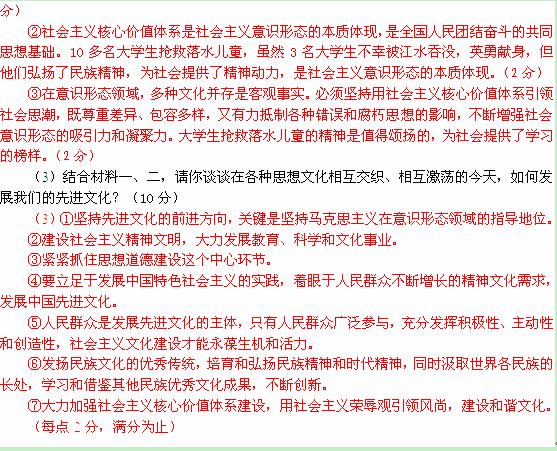 (2)结合材料二,用文化生活的有关知识谈谈建设社会主义核心价值体系的意义。(6分)