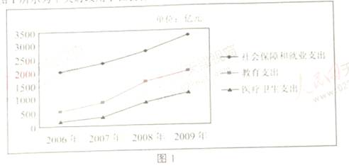 4、(2010年高考·天津卷4)图1所示为中央财政用于社会保障和就业、教育、医疗卫生的支出状况。