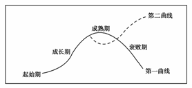 23.(2007·北京文综38)一般地说,企业的发展都要经历一个从“起始期”、“成长期”到“成熟期”、“衰败期”的生命周期,其运动轨迹被称为“第一曲线”。为了能够实现持续发展,避免衰败,企业需要在高峰到来之前,开辟一条新道路,这条道路发展的轨迹被称为“第二曲线”。