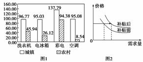 14.(2010·无锡联考)材料一 2009年2月1日起,江苏省13个省辖市同时启动家电下乡工程,对购买下乡家电产品的农民按最终销售价格的13%给予财政补贴。下列图1为2008年江苏省某市城乡居民每百户家庭家电拥有情况,图2为补贴前后农村家电需求量预计变化情况。