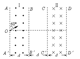 (16分)如图所示,条形区域Ⅰ和Ⅱ内分别存在方向垂直于纸面向外和向里的匀强磁场,磁感应强度B的大小均为0.3T,AA′、BB′、CC′、DD′为磁场边界,它们相互平行,条形区域的长度足够长,磁场宽度及BB′、CC′之间的距离d=1m。一束带正电的某种粒子从AA′上的O点以沿与AA′成60°角、大小不同的速度射入磁场,当粒子的速度小于某一值v0时,粒子在区域Ⅰ内的运动时间t0=4×10-6s;当粒子速度为v1时,刚好垂直边界BB′射出区域Ⅰ。取π≈3,不计粒子所受重力。