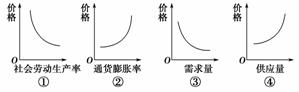 13.下列示意图反映的是通常情况下价格与相关因素的关系。其中①②④分别反映的是价格随社会劳动生产率、通货膨胀率、供应量变化的曲线,③反映的是需求量随价格变化的曲线。这些示意图中正确反映价格与相关因素关系的是 ( )