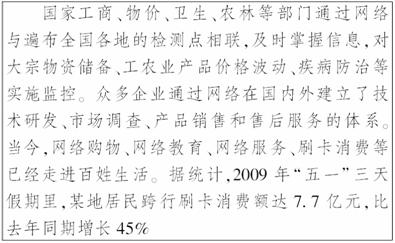 解析:正确解答必须在认真审读材料的基础上,从政府、企业和消费者三个角度说明网络给经济生活带来的积极影响,组织答案时必须规范使用经济学术语。
