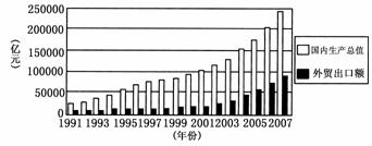 1991-2007年中国国内生产总值和外贸出口额变化情况