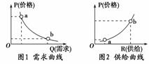 解析:图1,反映了需求与价格之间的反比例关系,①正确。图2反映了供给与价格之间的正比例关系,②正确。③本身说法错误。商品价格由价值决定,受供求关系影响,④错误。