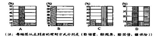 3.(原创)家庭的投资理财应根据不同的经济态势,采取不同的选择。目前当银行存款利率上调、同期国债利率高于存款利率、股市总体表现乏力,下列图示最适宜的家庭投资理财方式是