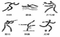 北京奥运会体育图标(右图为例)以篆字笔画为基本形式,抓住各种体育运动最主要的特征,结合现代图形的简化特征,显示出优雅的运动美感和丰富的文化内涵,达到了形与意的和谐统一,表现了中国悠久的历史文化特色和体育的活力与激情,诠释了人文奥运的理念。这体现了