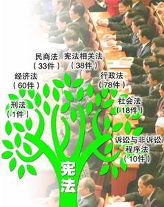 支撑法律体系的法律部门已经齐备。我国的法律体系是由宪法及宪法相关法部门、行政法部门、民事法部门、经济法部门、社会法部门、刑法部门及诉讼法及相关程序法部门等七个法律部门组成的。2、各法律部门中具有基础地位、在法律体系中起到骨架与支撑作用的基本法律已经具备。支撑宪法部门的选举法、立法法、监督法;支撑民法部门的民法通则、物权法;支撑刑法部门的刑法,支撑经济法部门的反垄断法、反不正当竞争法;支撑行政法部门的行政处罚法;支撑社会法部门的保险法、教育法;支撑诉讼法部门的三大诉讼法等,它们是在宪法的统领下调整目前我国政治、经济、社会、文化关系的基本法律。3、与法律相配套的行政法规、地方性法规业已体系化。到2011年2月底,除宪法以外,我国已制定现行有效法律239件、行政法规690多件、地方性法规8600多件,并全面完成对现行法律和行政法规、地方性法规的集中清理工作。他们共同发挥着对法律的补充、细化和具体化的作用。国家经济建设、政治建设、文化建设、社会建设以及生态文明建设的各个方面实现有法可依。