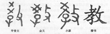 一只手拿着一根“教鞭”(棍棒),左下是一个“子”字,左上两个叉是被“教鞭”抽打的象征符号。金文、小篆只是甲骨文略加变形而已,演变至楷体,字形变化较大。宋朝朱熹依据“教”的楷体字形训诂字义:“‘文“孝’谓之‘教’。”这给我们的启示是