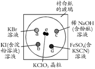 (10分)为了减少污染,使实验绿色化,学生按下列操作做一个实验:在一块下衬白纸的玻璃片的不同位置分别滴加浓度为0.1 mol/L的KBr、KI(含淀粉溶液)、NaOH(含酚酞)、FeSO4(含KSCN)溶液各1滴,每种液滴彼此分开,围成半径小于表面皿的圆形(如右图所示),在圆心处放置2粒芝麻大小的KClO3晶体,盖好表面皿。