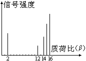 2002年诺贝尔化学奖获得者的贡献之一是发明了对有机分子的结构进行分析的质谱法。其方法是让极少量(10-9 g左右)的化合物通过质谱仪的离子化室使样品分子大量离子化,少量分子碎裂成更小的离子。如C2H6离子化后可得到C2H6+、C2H5+、C2H4+、……然后测定其质荷比β。设H+的质荷比为1,某有机物样品的质荷比如图(假设离子均带一个单位正电荷,信号强度与该离子多少有关),则该有机物可能是