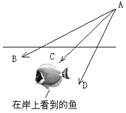 21、小明、小钟一起用鱼叉去抓鱼,在河边,他们看到一小鱼(如图),你认为他们应把鱼叉往哪个方向插下去?--------------------------------------( )