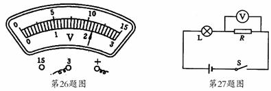 27.(12分) 在如图所示的电路中,闭合开关S,灯L不亮,电压表V有示数。已知电路中各处均接触良好,除灯 L 和电阻 R 外,其余元件均完好。